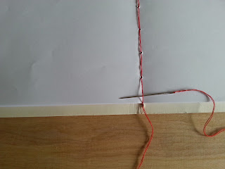 For this I used 2 metallic curtains and 2 net curtains. Using glitter card and different punches, I punched out shapes in different colours and then stitched them together on the sewing machine. I took a piece of wire the width of the metallic curtains and threaded it through the top of the net curtains. I hot glued the metallic curtains and strips of glittery shapes to the top of the net curtain. I put a couple of hooks on the wall and wound the end of the wire around the hooks.